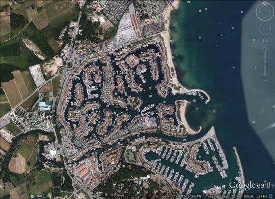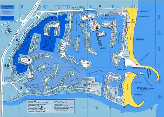 Der Yachthafen ist in drei Wasserflächen unterteilt: Plan d'eau PGI mit dem Vorhafen, wo die Geschwindigkeit wie in den Passagen auf 3 Knoten begrenzt ist, der Hafen, die Kanäle und der Fluss Giscle. Anschließend gelangt man über den Grand Canal in den Yachthafen. Zone 1 umfasst den Canal Oriental, den Canal du Nord, den Lac intérieur, den Canal Occidental und den Canal de la Giscle. Die zweite Zone ist der Plan d'eau PG Sud mit dem Grand Canal, dem Petit Canal, dem Canal du Midi und dem Port Sud. Schließlich ist die 3 e gebiet umfasst den Westhafen, den Kommunalhafen, La Désirade und das Grand Bassin.