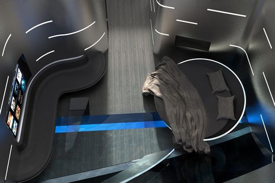 Der Grundriss des Unterdecks war für 10 Gäste und 8 Besatzungsmitglieder ausgelegt. Der Schlafraum des Eigentümers befindet sich am Heck des Bootes, über die gesamte Breite des Rumpfes. Es wurde mit einem aquatischen Thema gestaltet und umfasst einen großen Salon mit einem multifunktionalen Schreibtisch mit Oberflächenanzeige, ein Badezimmer mit einem Regenduschsystem und einen Ankleideraum. Im Gegensatz zu traditionellen Yachten haben die Eigner- und Gästekabinen eine Außenansicht und bieten dank Wand- und Bodenpaneelen aus monolithischem Polycarbonat [transparente Paneele] eine Unterwassersicht.