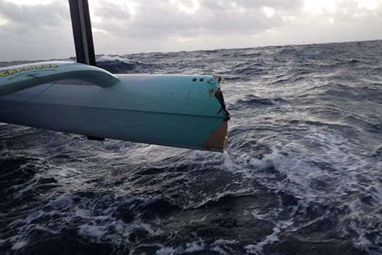 " Der Backbord-Schwimmer fehlt 5 bis 6 m und der Steuerbord-Schwimmer ist über 1 m beschädigt. Die Schwierigkeit besteht nun darin, das Boot auf einem einzigen Schwimmer zurückzubringen. Unser Wetterrouter arbeitet an einer idealen Route, um unter den bestmöglichen Bedingungen zurückzukehren. Wir steuern mit reduzierter Geschwindigkeit (6 Knoten) unter Segeln auf Brest zu, das wir in 3 Tagen erreichen sollten fügte Yvan Bourgnon hinzu.