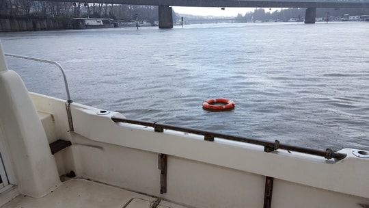 Vierte Übung: "Mann über Bord". Gerald wirft die Kronenboje auf die Seine und erklärt mir, wie man jemanden rettet, der ins Wasser gefallen ist. Man macht eine große Wende und lässt so viel Platz wie möglich zwischen dem Mann über Bord und dem Boot, um ihn nicht zu verletzen. Dann geht man in den Leerlauf und stellt sich zwischen die über Bord gegangene Person und den Wind, bevor sie so nah ist, dass man sie mit einem Bootshaken bergen kann.