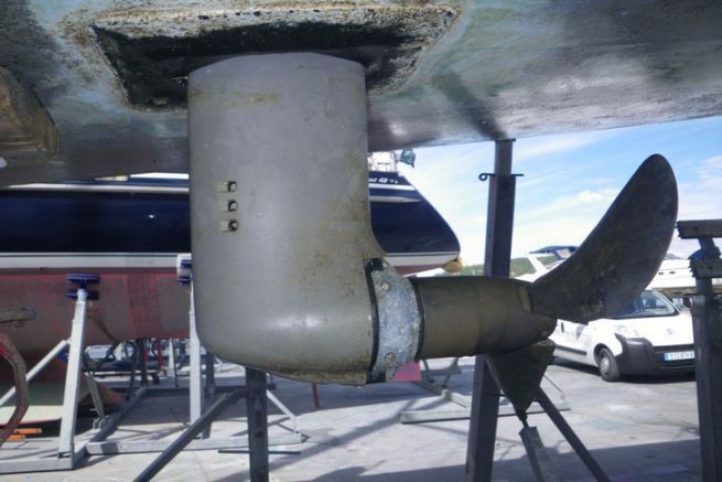 Bei dieser Montage sind die Vibrationen minimal. Das Gelenk vermeidet in der Tat jede Übertragung. Für Werften ist die Anpassung eines Segelantriebs einfach, da der Motor und der Antrieb in einem Stück kommen. Durch die Möglichkeit, den Motor vorne (wie auf unserer Skizze) oder hinter der Basis zu platzieren, bietet der Sail-Drive mehrere Vorteile, um die Montage zu erleichtern. Diese Art der Motorisierung wird häufig bei Katamaranen gewählt. Der Segelantrieb passt aber nur auf Motoren mit weniger als 75 PS. Daher ist er auf großen Yachten nicht zu finden.