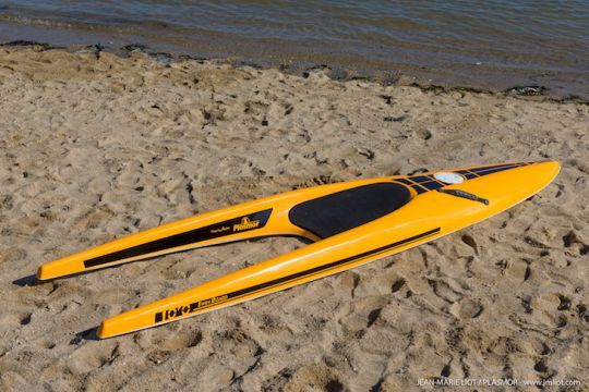 Dieses Schwimmbrett besteht aus Verbundwerkstoff (innerhalb des Unternehmens, das seine Produkte entwickelt, produziert und vermarktet) und wiegt weniger als 10 kg. Ein Leichtgewicht, das seine Länge - 3 m - ausgleicht und für den Transport eine Autogalerie benötigt. Doch gerade durch seine längliche Größe wollte sich das Unternehmen von anderen Schwimmbrettern unterscheiden, um die Sicherheit zu erhöhen, wie Sébastien von Plasmor erklärt.