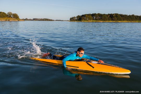 Die Umsetzung ist einfach, da nur eine Kombination und ein Paar Flossen benötigt werden, um sich ins Wasser zu wagen. So ausgestattet genügt es, sich auf das Brett zu legen, dessen Konturen den Körper umrahmen. Der Torso ruht dann auf dem Brett und die Beine sind im Wasser und treiben die Maschine an. Griffe werden zum Aufhängen verwendet, aber man kann auch mit den Armen rudern. Das Swimboard wird derzeit in einer einzigen Länge (3 m) angeboten, aber seine Verwendung ist Familie" Jeder kann es benutzen, sogar Kinder. Es kann eine Spielmaschine am Strand werden, die Nutzung ist sehr breit. Und da wir nur den unteren Teil des Körpers eingetaucht haben, können wir ihn auch länger in der Saison verwenden" details Sébastien.