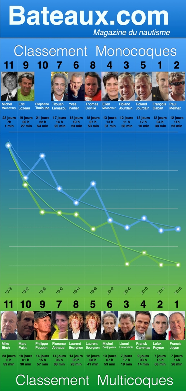 Heute, obwohl das Wetter die große Unbekannte bei dieser Transatlantikfahrt bleibt, zeichnet sich ein neuer Trend ab, bei dem die Kurven tendenziell flacher werden. Der Unterschied zwischen dem Rekord von Loïck Peyron im Jahr 2014 und dem von Francis Joyon im Jahr 2018 beträgt nur 38 Minuten und weniger als 2:50 Stunden zu dem von Lionel Lemonchois im Jahr 2006.