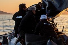 Zuerst versuche ich nur, es allein zu schaffen die Tribord 5S . Intuitiv setze ich mich auf den Pudding, der mich wie eine Bank zu begrüßen scheint. Eine leichte Brise weht mit 12 Knoten über den Balken, ich setze das Großsegel und entdecke die erste Sensation des Segelfliegens. Das Boot ist sehr leicht, genau wie ein Paddel, es ist nicht im Wasser versunken. Er scheint nur scheinbar über die Meeresoberfläche zu gleiten, und dank des großzügigen Segels beschleunigt er sofort.
