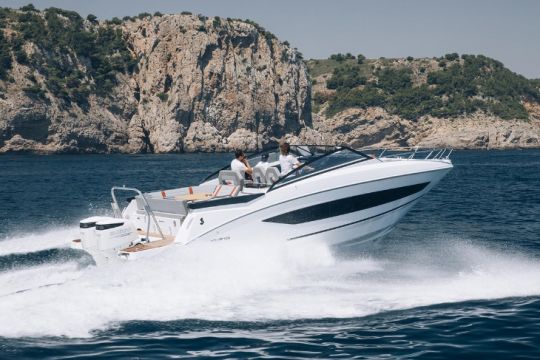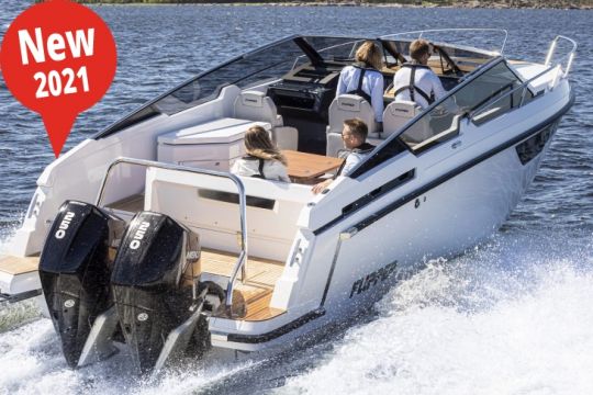 Das größte Modell der Flyer-Reihe - 9,63 m lang - befindet sich an der Kreuzung zwischen einem Kreuzer und einem Tagesboot. Sie bietet eine große, komfortable und gut ausgestattete Decksfläche sowie zwei Kabinen und eine Toilette. Aber was ihn charakterisiert, sind die beiden großen 350 PS-Außenborder, die ihm eine Höchstgeschwindigkeit von 44 Knoten verleihen.