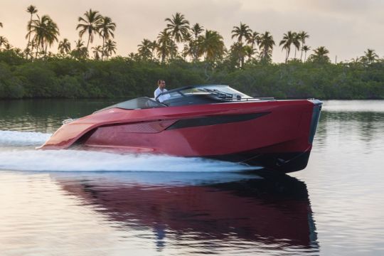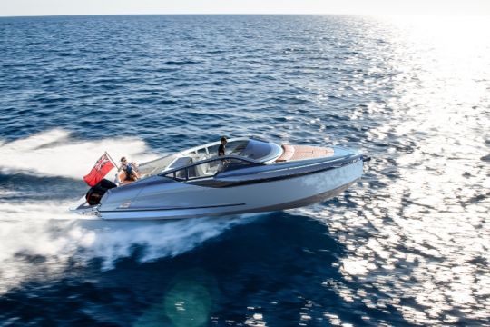 Die F//Line 33 ist ein sportlicher und eleganter Kabinenkreuzer, der auf Geschwindigkeit ausgelegt ist. In seiner Außenbordversion verfügt er über drei Typen von Mercury-Verado-Motoren (2x300, 2X350 und 2X400 PS), die ihm eine Höchstgeschwindigkeit von 45 Knoten verleihen. Um den Zugang zum Wasser zu erleichtern, hat der britische Hersteller sein Modell mit einer untertauchbaren Plattform ausgestattet, die die Motoren umrahmt. Im Inneren gibt es eine luxuriöse Kabine mit bis zu 4 Kojen und einer Toilette.