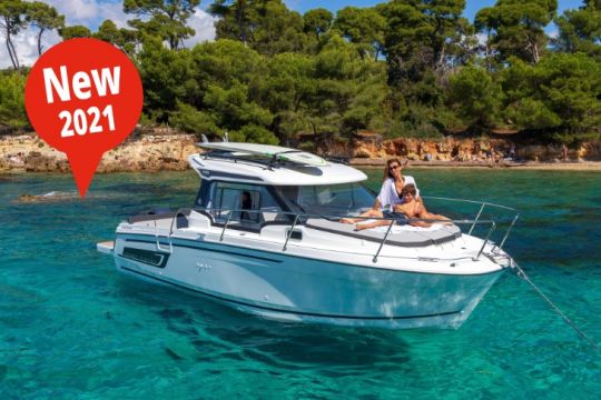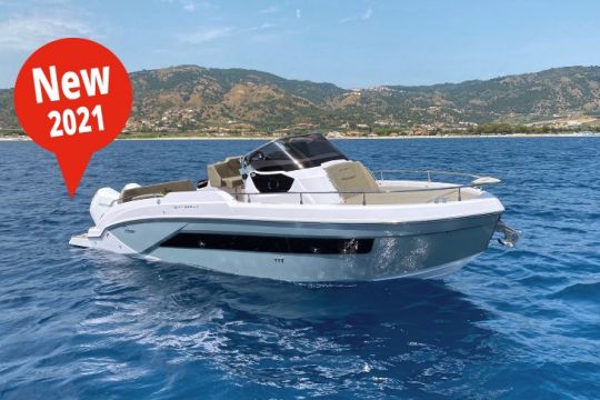 Dieses 11 m lange Modell verfügt über eine große Windschutzscheibe mit einem verlängerten Hardtop-Revers, in dem eine Backbord-Öffnung den Zugang zum bequemen Bugfahrer am Bug ermöglicht. Mit seiner Einteilung für 4 Personen und seiner voll ausgestatteten Kombüse sowie seinen zahlreichen Stauräumen und Badezimmern können Sie das Vergnügen, auf dem Wasser zu sein, problemlos verlängern.
