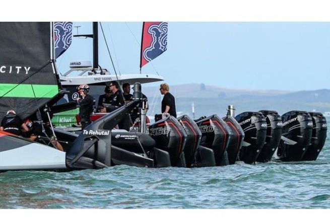 Mit dieser neuen Generation von sehr schnellen Segelbooten stehen die Motorenhersteller der Begleitboote vor einem Problem: Um schnell zu fahren und mit den America's-Cup-Booten mithalten zu können, müssen die Beiboote lang sein (ca. 10 m). Wenn sie lang sind, sind sie schwerer. Und diese Gewichtszunahme erfordert eine hohe Motorleistung. CQFD. So sehr, dass Innenbordmotoren nicht mehr leistungsfähig genug sind und Außenbordmotoren Platz machen müssen.