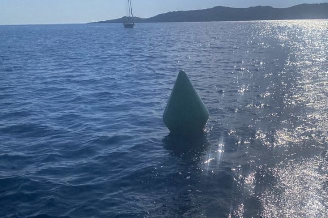 Diese Boje markiert den Einfahrtskanal zum Hafen. Ein Stück weiter befindet sich eine weitere Boje (diesmal rot), die die Durchfahrt zwischen den beiden Bojen anzeigt, um den Hafen in aller Sicherheit zu erreichen.