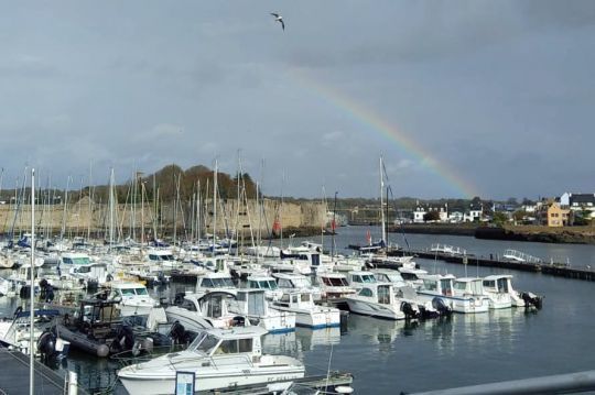 Ein Regenbogen empfängt mich. Ich komme auf dem Steg an. Von weitem sehe ich meine Solarpaneele an ihrem Platz; dass sie wegfliegen würden, war eine meiner Befürchtungen. Der Ceci geht es gut. Sie ist an ihrem Platz. Sie hat nichts berührt. Nichts hat sie gerammt. Ich öffne sie. Nichts hat sich bewegt. Es sieht nicht so aus, als hätte ein Sturm daran gerüttelt.