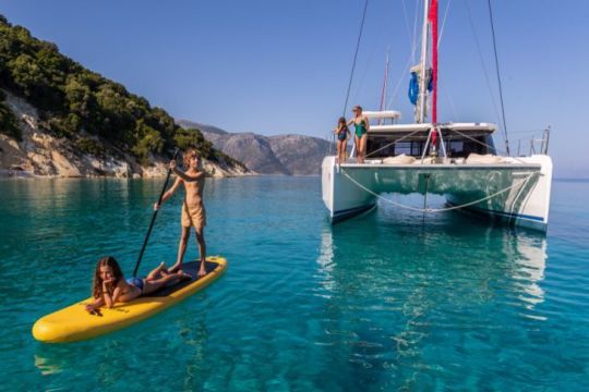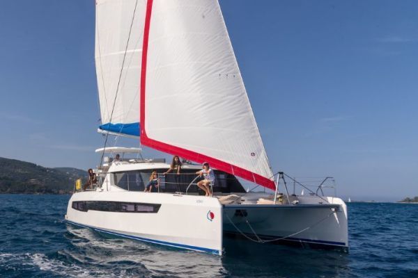 Das Segeldesign ermöglicht eine gute Leistung, insbesondere mit der überlappenden Genua, und bietet gleichzeitig einen Lounge-Bereich auf dem Dach. Der Steuerstand auf halber Höhe sorgt für eine gute Kommunikation zwischen Steuermann und Crew. Der Katamaran und sein geringer Tiefgang ermöglichen es Ihnen, die geheimen Buchten des Mittelmeers in Küstennähe zu entdecken.