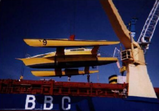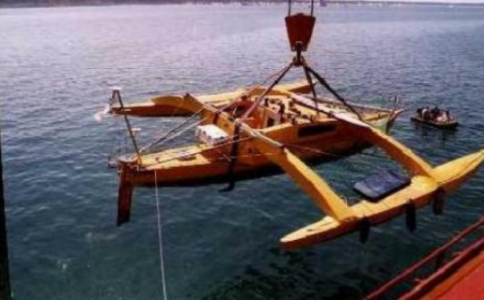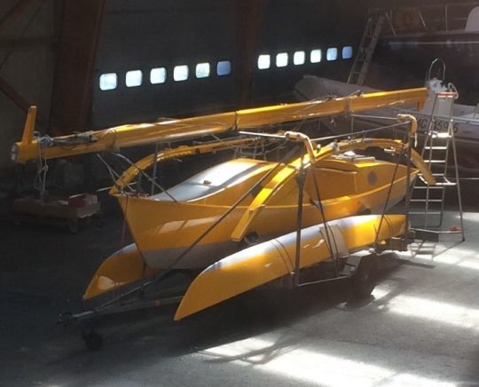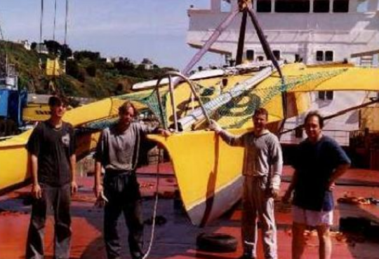 Zu dieser Zeit hatte ich eine Werft. Wir haben das Boot hier wieder zusammengebaut, ich habe einen Mast bestellt, wir haben es inspiziert und daran herumgebastelt. Wir ließen es im nächsten Jahr, 2000, wieder zu Wasser. Wir segelten ein bisschen, aber wir merkten, dass es ein bisschen müde war und sich hin und her wälzte. Im nächsten Jahr, 2001, beschlossen wir, ihn nach La Trinité zu Charlie Capelle zu bringen, um alles neu zu machen. Wir haben alles überholt, alles inspiziert und er blieb fast fünf Jahre dort. Wir haben die Ausleger, die Schwimmer und das Deck neu gemacht, aber wir haben den zentralen Rumpf nicht zu sehr berührt. Wir mussten das Boot 2006 oder so wieder zu Wasser lassen.