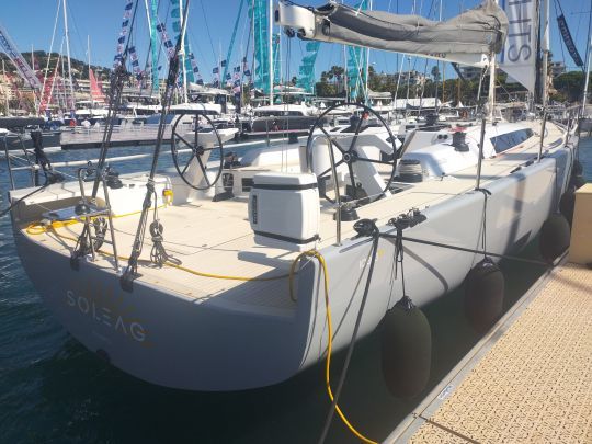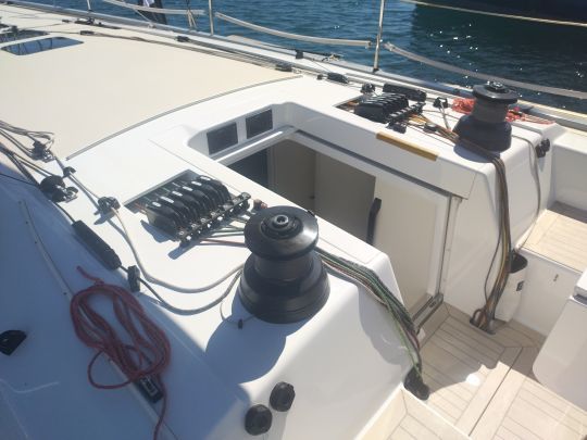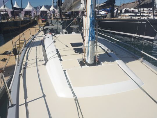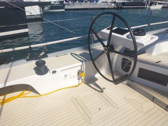 Der Decksplan ist ganz auf das Regattasegeln mit einer Crew ausgerichtet. Es ist schlank, ohne Zugeständnisse an den Komfort, und alles ist darauf ausgelegt, schnell zu manövrieren. Der Axxon-Mast aus hochmoduligem Karbon, der von beeindruckenden Wanten gehalten wird, erreicht eine Höhe von 24 Metern.