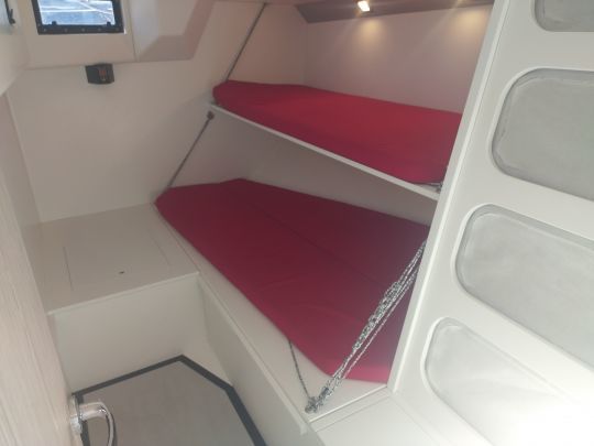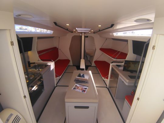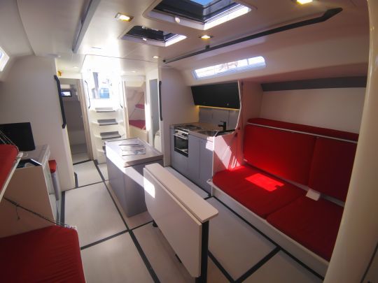Die Bannetten auf Verbundstoffrahmen bieten Platz für 10 Besatzungsmitglieder, von denen vier im Salon Platz nehmen. Weiter vorne befindet sich der Bugspitz, der völlig leer ist und dessen einziger Nutzen darin besteht, Vorwindsegel zu lagern. Dasselbe gilt für den Bereich zwischen dem Mastfuß und dem vorderen Peak, in dem es keine Einrichtungen gibt.