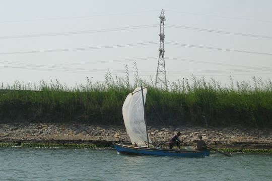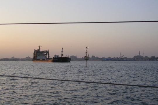 Am späten Vormittag, nachdem die Verwaltungsformalitäten erledigt waren, begrüßten wir einen Lotsen der Suez Canal Authority an Bord. Er wird uns bis nach Ismailia, unserem nächtlichen Zwischenstopp, begleiten. An Bord ist die Aufregung groß. Rundherum ist die Wüste. Vor und hinter uns liegen Milliarden Tonnen von Gütern, die die Weltwirtschaft antreiben. An den Ufern liegen winzige Boote mit Segeln aus plastifizierten Planen, die von einer anderen Realität zeugen.