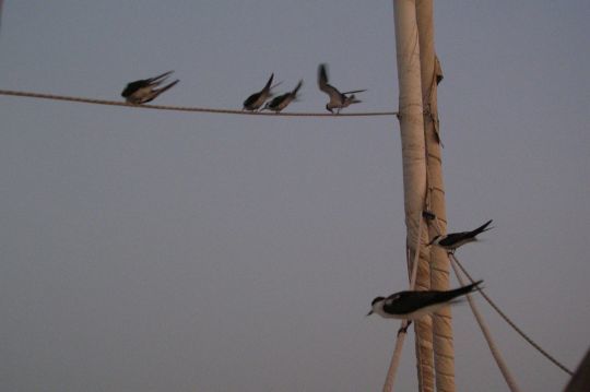 Wir begegnen Schweinswalen, die Thunfischschwärme jagen, und Grindwalen, die nach Norden gleiten. In den Nächten suchen erschöpfte Vögel Zuflucht auf dem Deck. Und oft begleiten Delfine unseren Bug als treue Weggefährten.