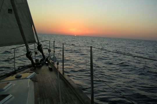 Sobald der Pilot in Suez, am Tor zum Roten Meer, von Bord geht, hissen wir das Großsegel und rollen die Genua aus. Annka fährt, getragen von einem kräftigen Seitenwind, mit ungeahnten Geschwindigkeiten. Die Nacht bricht herein und taucht das Meer in ein goldenes Licht, das von einem riesigen Mond geworfen wird. Es folgen drei Tage und drei Nächte auf See unter einem kristallklaren Himmel. Die Sonne brennt, das Meer ist offen und das Gefühl von Geschwindigkeit und Freiheit ist berauschend.