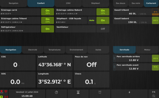 ShipHeart ersetzt die klassische Schalttafel, zentralisiert alle Informationen auf einem 10,1-Zoll-Touchscreen und lässt sich auch über ein Smartphone oder Tablet steuern, das über Wifi oder 4G verbunden ist. Dieses Plug & Play-System vereinfacht die Installation und ermöglicht eine schnelle Integration ohne spezielle Werkzeuge. Tatsächlich genügt es, eine neue Komponente (Pumpe, Sensor, Gerät...) an das Netzwerk anzuschließen, damit sie sichtbar wird und auf dem Bildschirm erscheint. Dann kann man ihr die gewünschte Betriebsart zuweisen. All dies ist ohne Programmierung oder besondere technische Kenntnisse möglich.