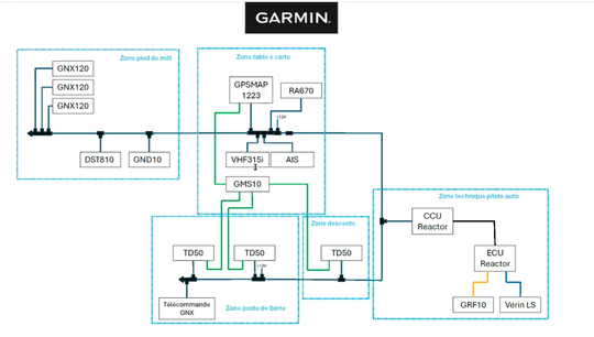 Die neue Konfiguration basiert auf einem vollständigen NMEA-2000-Netzwerk. Am Kartentisch zentralisiert ein GPSMAP 1223 (12-Zoll-Multifunktionsplotter) die Navigationsdaten. Er kommuniziert mit einer Windfahne und einem Windmesser GND10 und einer Sonde DST810 (Tiefe, Geschwindigkeit, Temperatur).