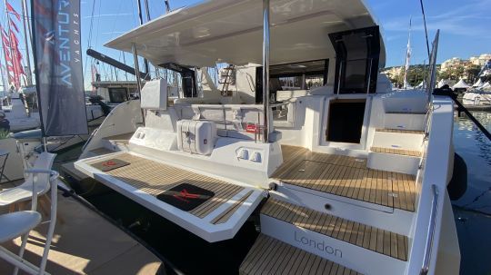 Der Nachfolger der Aventura 44 zeichnet sich durch eine modernisierte Silhouette aus, die von umgekehrten Bugspitzen, einem integrierten Deckshaus und großen Rumpffenstern geprägt ist. An Bord ist der Helligkeitsgewinn sofort spürbar. Das Deck beherbergt einen erhöhten Steuerstand auf halber Höhe auf der Backbordseite, der einem auf dem Deckshaus installierten Manövrierstand vorgelagert ist. Dadurch wird der Zugang zur Steuerbordflybridge freigegeben, die eher eine halbe Zwischenebene als ein echtes Oberdeck ist.