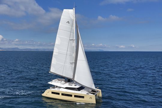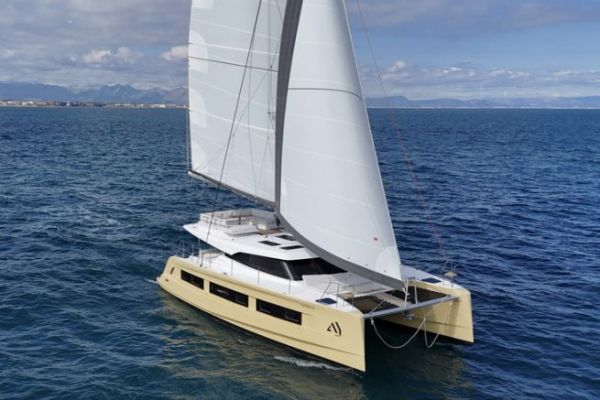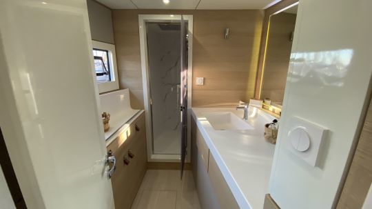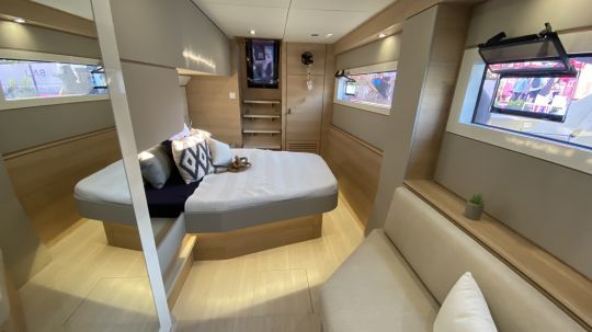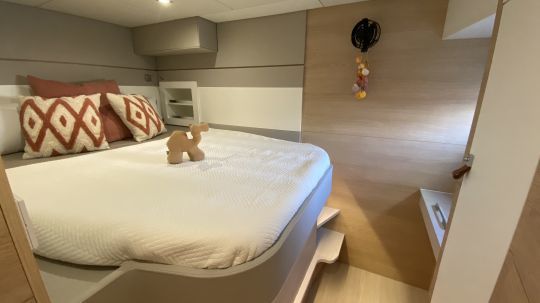 Bei der Frage nach der Ausstattung hebt sich die Aventura 45 deutlich ab. Der Katamaran kann in drei, vier, fünf oder sechs Kabinen mit bis zu vier Nasszellen konfiguriert werden. Die in das Cockpit eingebauten Abstiege ermöglichen den direkten Zugang zu einigen Achterkabinen, insbesondere bei den Eignerversionen. Diese Flexibilität ist in dieser Klasse selten. Die senkrecht zur Wasserlinie verlaufenden Schlafplätze optimieren den Raum, ohne die Zirkulation zu beeinträchtigen.