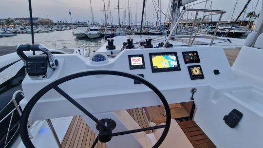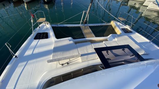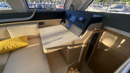 Der Verzicht auf den Mast vor dem Deckshaus zugunsten eines Mastes, der auf dem Deckshaus steht und im Salon von einem Schwamm gestützt wird, hat eine Neuverteilung der Volumen ermöglicht. Der zentrale Salon beherbergt eine L-förmige Küche, einen Navigationsbereich mit einer Garmin EmpirBus-Zentrale und eine große Dinette. Das Ganze bleibt fließend, hell und bietet dank der abgesenkten Seitenwände und des Designs der Verglasung einen freien Blick nach draußen.