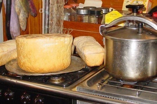 - Kardanischer Gasherd und topfhalter sind selbst auf einem Katamaran unverzichtbar.