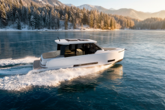 Die Lufteinlässe sind in eine durchgehende Linie integriert und vereinen so Funktionalität und Ästhetik. Die seitlichen Rumpfverglasungen ermöglichen eine großzügige Verteilung des natürlichen Lichts in den beiden Doppelkabinen unter Deck. Die Materialwahl im Inneren basiert auf einer Mischung aus Alcantara, Alpi Holz und strukturierten Oberflächen, die ein warmes und zeitgemäßes Ambiente schaffen.