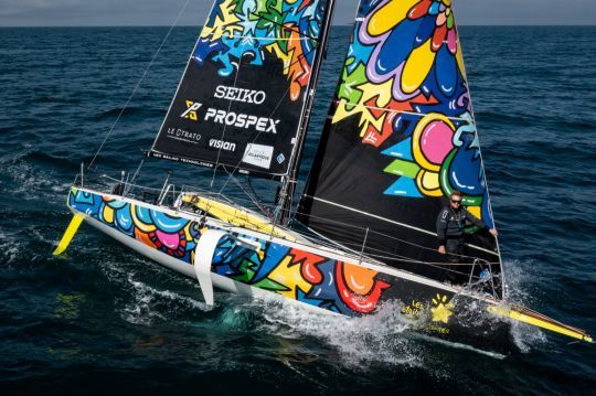 Das Besondere an dieser Ausrüstung ist die Integration der farbenfrohen Motive des Pop-Art-Künstlers Leloluce. Leichte Jacke, Latzhose, Merino-Midlayer und Schwimmweste wurden gemeinsam mit Vlamynck entworfen, um den Anforderungen einer anspruchsvollen Seefahrt gerecht zu werden. Die Farben erinnern an die Farben des Vereins Les Étoiles Filantes, der Kinder mit Hirntumoren begleitet.