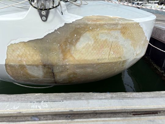 Ausschneiden der delaminierten Laminatteile, Neuaufbau der Crashbox, Neuverzinken, Laminieren und schließlich eine Schicht Gelcoat zur Abdichtung: eine echte Kommandoaktion, die mit voller Kraft durchgeführt wurde, damit das Boot wieder pünktlich starten konnte.