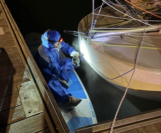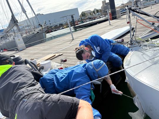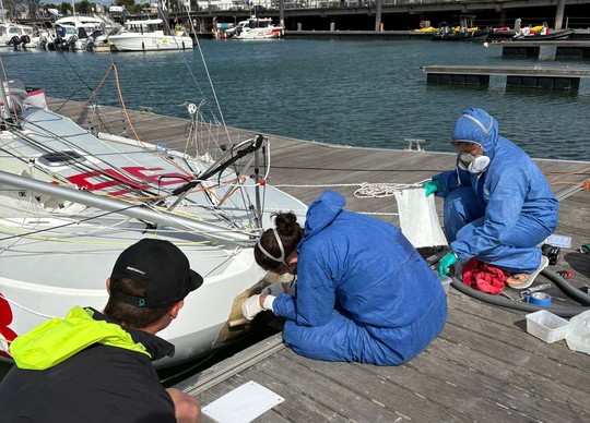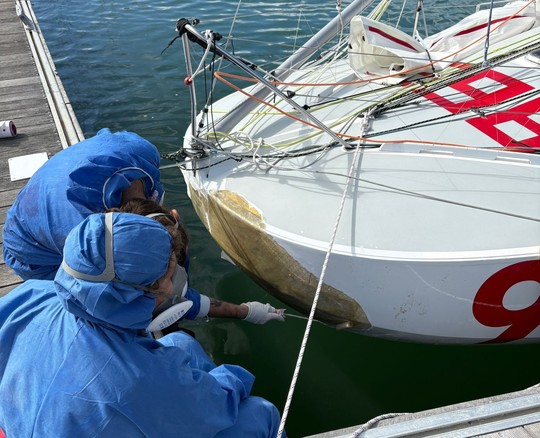 Während Sophie Delannoy bereits um 18.30 Uhr weiterfahren konnte, schien Gabriels Situation gefährdeter zu sein. Victor Brodeur, Composit Boat Builder der SKAW-Werft, und Anne-Gaëlle Gourdin, die beim letzten Mini mitgelaufen war, mobilisierten sich sofort. Ohne zu zögern machten sie sich ab 17 Uhr an die Arbeit und legten fast 24 Stunden ununterbrochenen Einsatz mit kaum 30 Minuten Schlaf hin.