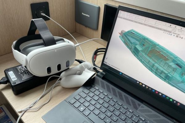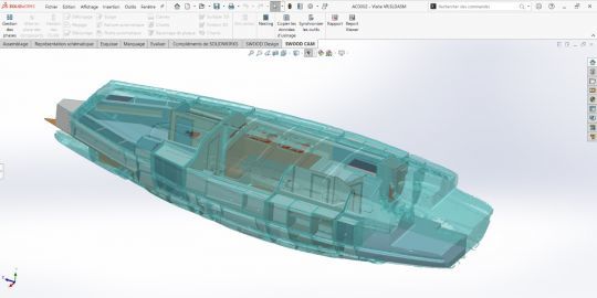 Vor jedem Eingriff wird das Innere des Bootes zerlegt und anschließend der leere Rumpf mit einem Laser gescannt. Auf diese Weise entsteht eine auf den Zehntelmillimeter genaue Punktwolke, die die Grundlage für den digitalen Zwilling des Bootes bildet. Auf diesem Werkzeug werden die verschiedenen Ausstattungen simuliert und mithilfe eines Virtual-Reality-Helms immersiv visualisiert. Diese Vorstufe ermöglicht die Validierung von Volumen, Verkehrsströmen und technischen Bereichen.