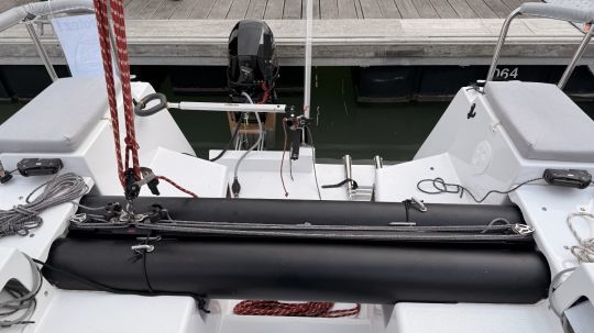 Das drehbare Schwert und das hochklappbare Ruderblatt sorgen für mehr Sicherheit in flachen oder überfüllten Gewässern. Der Tiefgang kann zwischen 0,35 m und 1,80 m variieren. Diese technische Entscheidung, kombiniert mit einer leichten Verdrängung von 1100 kg, ermöglicht es, ohne Einschränkungen auf Grund zu laufen und an den Strand zu gelangen. Der Rumpf, der aus Infusionsverfahren hergestellt wird, bietet einen guten Kompromiss zwischen Leichtigkeit, Steifigkeit und Produktionskosten. Die Decksausstattung bleibt schlicht mit einem Cockpit, das durch Luken geschützt ist. Ein Motor mit maximal 10 PS kann auf einem Stuhl montiert werden.