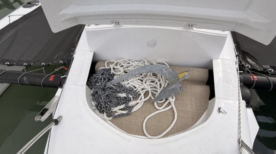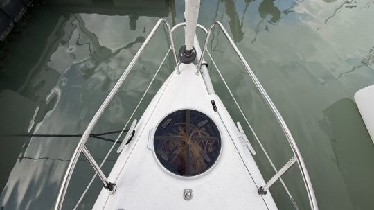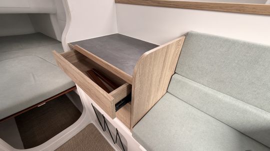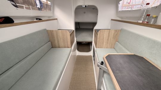 Das Innenvolumen des 26.5 ist ein bemerkenswerter Fortschritt in der Modellreihe. Die vordere Kabine, die durch ein Tuch abgetrennt ist, bietet eine Doppelkoje mit einer Kopfhöhe von 1,40 m, die sich auf 1 m am Fußende verjüngt. Der Salon mit einer Stehhöhe von 1,80 m umfasst zwei Seitenbänke, die in ca. 60 cm breite Kojen umgewandelt werden können (Verlängerung der Kojen im Durchgang für die Dauer der Übernachtung). Die Innenausstattung bleibt grundlegend: eine Spüle, ein kleiner Kocher, Süßwasser und ein Toilettenbereich unter der vorderen Koje. Diese Konfiguration zielt eindeutig auf mehrtägige Ausflüge auf Küstengewässern ab, wobei ein Mindestmaß an Komfort für eine vierköpfige Familie erhalten bleibt.
