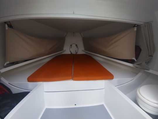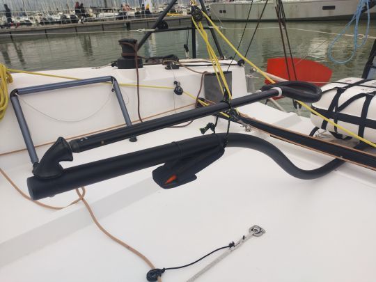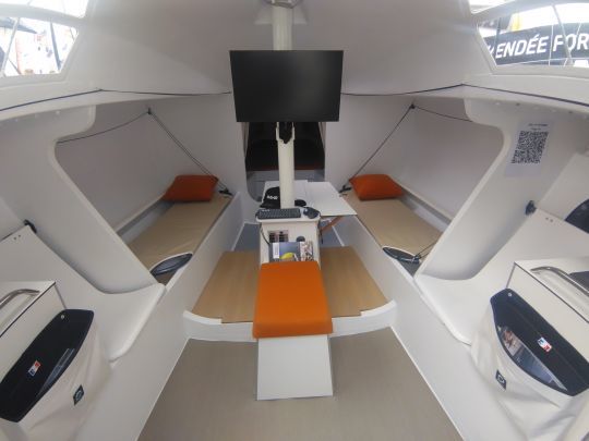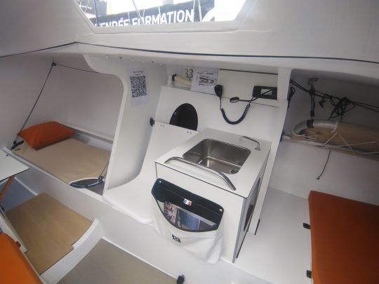 Das Ganze strahlt Regattatauglichkeit und Präzision aus. Der Decksplan, der in Zusammenarbeit mit Seglern erarbeitet wurde, legt Wert auf eine flüssige Bewegung und schnelle Trimmung. Die seitlichen und hinteren Ballasttanks zeugen von dem Willen, das Boot sowohl mit voller Besatzung als auch im Doppelpack leistungsfähig zu machen.