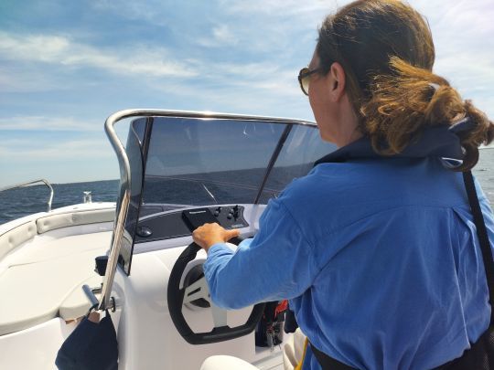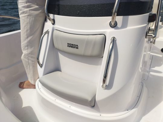 Die übersichtliche und moderne Honda-Instrumentierung beschränkt sich auf das Wesentliche: Drehzahlmesser, Trimm- und Geschwindigkeitsanzeigen, PR70-Multifunktionsdisplay und ein zugänglicher Batteriehauptschalter. Auf der Backbordseite befinden sich einige Schalter, die die Navigationslichter und die automatische Bilgenpumpe steuern. So behält das Cockpit seinen funktionalen Geist bei, ohne optisch überladen zu wirken.