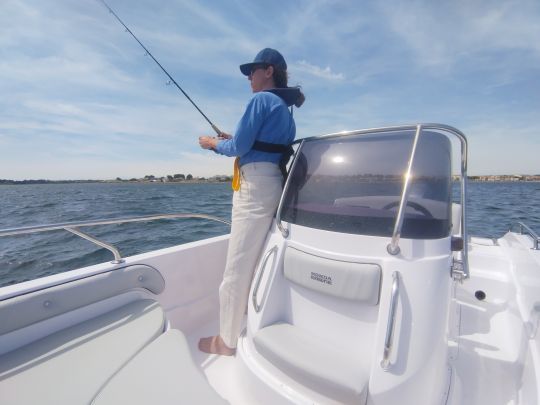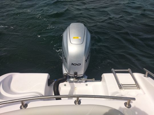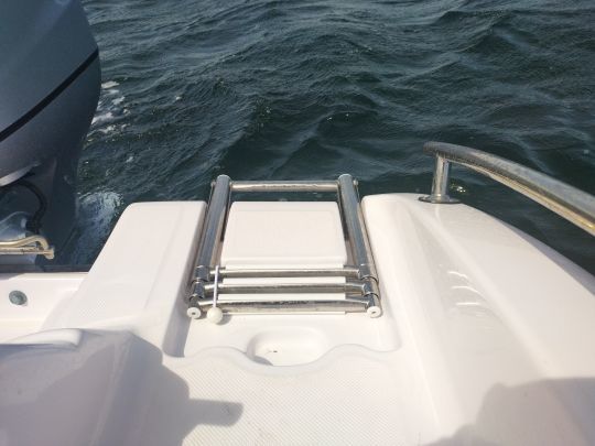 Im Heck bietet das Cockpit eine schöne Tiefe, die durch großzügige Freiborde gesichert ist. Dieser offene und robuste Raum ist das Herzstück des Bootes und dient gleichzeitig als Angelplatz, Entspannungszone oder als Plattform für den Zugang zum Meer. Die Rückbank integriert einen großen Kofferraum, in dem die Batterien und der Sicherungskasten untergebracht sind. Der Zugang ist einfach und die Innenausstattung ist zwar roh, aber sauber und gepflegt. Eine Badeleiter aus Edelstahl, die an der Steuerbordplattform befestigt ist, ermöglicht einen einfachen Aufstieg an Bord, der durch eine optionale Süßwasserdusche ergänzt wird.