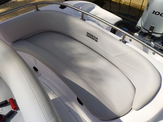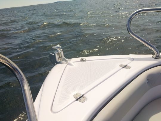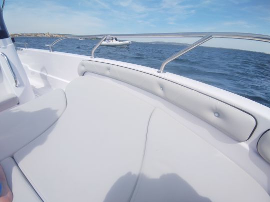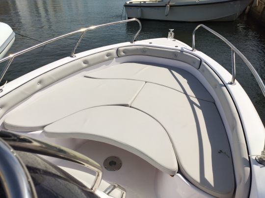 Das dicke, gut sitzende Polster ruht auf einer Reihe von Kästen, die für diese Rumpfgröße erstaunlich viel Stauraum bieten. Wenn man die Polster herausnimmt, kommen mehrere geformte Luken zum Vorschein, in denen die Ankerausrüstung, die Schwimmwesten und die Sicherheitsausrüstung untergebracht sind. Die optional erhältliche elektrische Ankerwinde passt perfekt in den Ankerkasten, ohne das Deck zu blockieren.