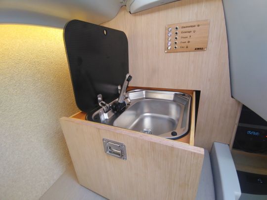 Für diejenigen, die noch mehr Vielseitigkeit wünschen, bietet die Werft einen umbaubaren Innenraum im Stil eines Van-Life an: Küchenzeile, Stauraum, maßgefertigte Polsterung und elektrische Anlage vom Typ Ecoflow mit Kühlschrank, Spüle und Kocher. Ein Anhänger für den Straßenverkehr ist ebenfalls erhältlich, ebenso wie ein Lieferservice in ganz Frankreich.