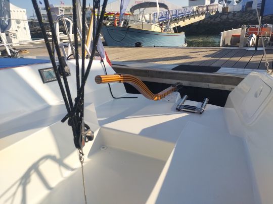 Auch die GV-Schiene, die den Verkehr behinderte, ist nicht mehr vorhanden. Der Zugpunkt der Großschot wird von einer Schot am Cockpitboden übernommen, die leicht entfernt werden kann, um den Baum zu überholen, wenn das Boot vor Anker liegt.