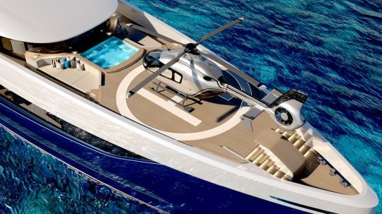Die LIVIA 72 gibt eine Vermessung von 1.700 BRZ bei 72 Metern Länge an, was einen sehr großzügigen Durchschnitt darstellt. Dieses Volumen ermöglicht es, 12 Gästekabinen, eine Eignersuite, einen Wellnessbereich, einen Beachclub mit Klappterrassen, eine Buggarage und einen Hubschrauberlandeplatz anzubieten. Im Klartext: alles, was man normalerweise auf Einheiten von 80 Metern und mehr findet.