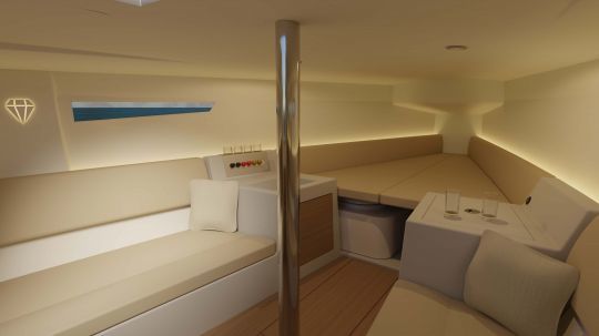 Der Leopard kündigt vier echte Schlafplätze und eine kleine Küche an. Der Innenraum ist hell und modern. Mit einer Rumpflänge von 8,40 m (9,20 m mit Bugspriet) bleibt der Platz an Bord überschaubar, scheint aber für verlängerte Wochenenden nutzbar zu sein. Wir bleiben bei einem Dayboat, aber die Vielseitigkeit mit einem schönen Wohnraumvolumen.