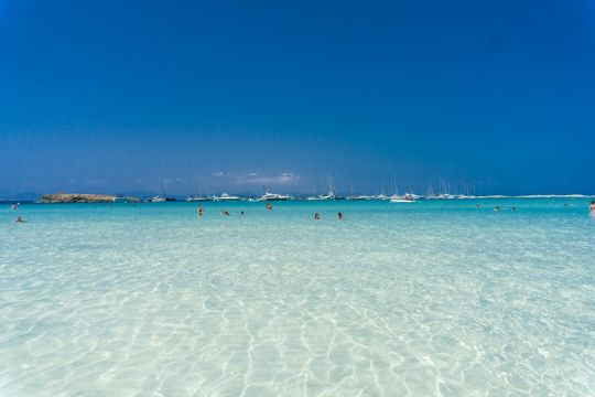 Im Norden durch einen schmalen Wasserarm getrennt, die kleine Insel Espalmador scheint zwischen Himmel und Meer zu schweben. Bei Flut ist der Pass fast geschlossen; bei Ebbe lässt er einen Sandweg erahnen. Die Navigation dort erfordert Vorsicht: wenig Grund, manchmal starke Strömungen und ein streng geschütztes Gebiet.