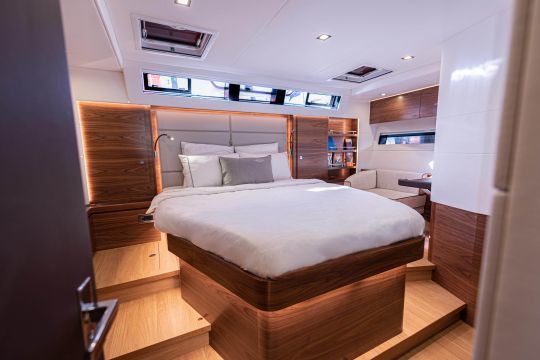 Dieses Modell Amel 60 wird in einer überarbeiteten Version der Innenausstattung präsentiert. Die riesige Achterkabine bleibt dem Eigner vorbehalten, während die beiden vorderen Kabinen neu gestaltet wurden: eine Doppelkabine mit Sessel und Schminktisch und eine Kabine mit Etagenbetten. Jeder Raum behält seine eigene Nasszelle. Diese neue Anordnung soll den immer häufigeren Anfragen von Eignern gerecht werden, die ihre Familie oder ihre Crew an Bord nehmen möchten.