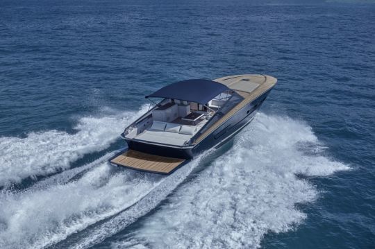 Unter der hinteren Sonnenliege befindet sich ein Volumen von 1800 Litern, in dem Wasserspielzeug und kleine Ausrüstungsgegenstände problemlos verstaut werden können. Das neu gestaltete Achterdeck ermöglicht auch eine Verlängerung des Cockpitbereichs. Der Zugang zum Boot erfolgt über eine Tür auf der Backbordseite. Eine Außenküche bietet Platz für Kühlschrank, Spüle, Eiswürfelmaschine und Induktionskochfeld.
