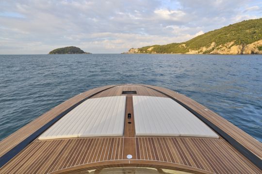Der Zugang zur Bugspitze erfolgt nicht mehr durch die Mitte der Windschutzscheibe, sondern durch einen seitlichen Durchgang an Steuerbord. Diese Verschiebung macht den Abstieg zur Kabine frei und lässt die Luke zum Hauptdeck offen. Eine nützliche Konfiguration für die Belüftung und vor allem flüssiger beim Hin- und Herfahren. Auf der Cockpitseite wurden zwei Lebensbereiche geschaffen: ein klassischer Heckbereich mit U-förmigen Sofas und eine zweite geschützte Ecke, die näher an der Windschutzscheibe liegt, um zu segeln, ohne zu viel Wind zu spüren. Das Ganze bietet Platz für bis zu 10 Personen.