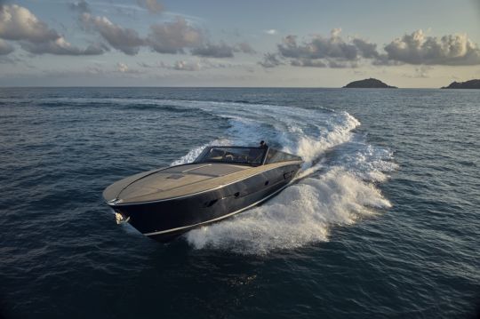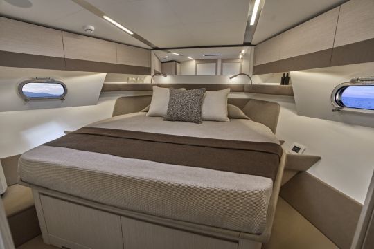 Die Steuerkonsole ist mit zwei 12-Zoll-Simrad-Bildschirmen (erweiterbar auf 16), einem Doppelsessel mit integrierten Getränkehaltern und Ablagemöglichkeiten ausgestattet. Die Vollrahmen-Panoramaverglasung streckt die Silhouette und bringt mehr Licht in den Raum.