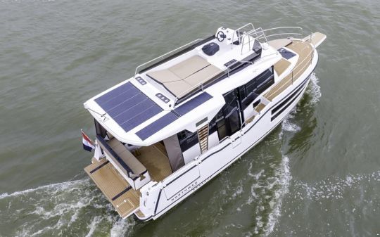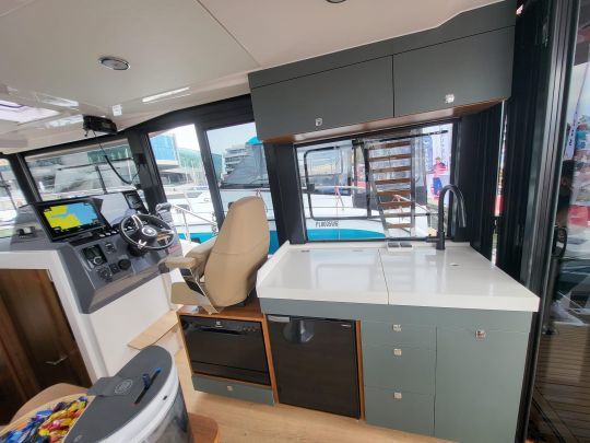 Der Zugang zum Fly erfolgt über den Bug, wodurch der hintere Teil des Bootes frei bleibt und man sich sicher bewegen kann. Auf dem Fly befindet sich eine Sonnenliege und ein optionaler Steuerstand. Auf dem Heck können Solarpaneele angebracht werden, ein Pluspunkt für die Energieautonomie.