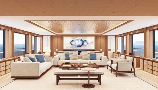 Der Light63M nimmt ein vom Mittelmeerraum inspiriertes Ambiente an: natürliche Materialien, schlichte Farbtöne, integrierte Möbel und abnehmbare Elemente. Dieser Ansatz zielt auf eine hohe Individualität ohne übermäßige technische Komplexität ab. Die Anordnung des Fitnessraums mit Panoramablick und Lichtschächten, die privaten Terrassen für die Eignersuite und die VIP-Kabine verdeutlichen dieses Bestreben, anpassungsfähige Lebensräume zu bieten.